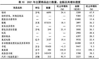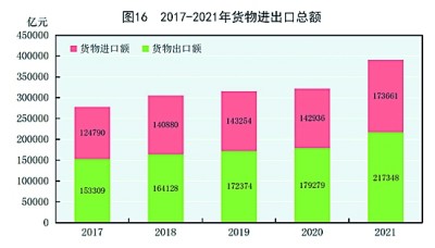全年貨物進(jìn)出口總額391009億元,比上年增長21.4%。其中,出口217348億元,增長21.2%;進(jìn)口173661億元,增長21.5%。貨物進(jìn)出口順差43687億元,比上年增加7344億元。對(duì)“一帶一路”[44]沿線國家進(jìn)出口總額115979億元,比上年增長23.6%。其中,出口65924億元,增長21.5%;進(jìn)口50055億元,增長26.4%。(見圖16)(見表9)(見表10)(見表11)(見表12)
