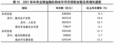 全年社會(huì)融資規(guī)模增量[45]31.4萬億元,按可比口徑計(jì)算,比上年少3.4萬億元。年末社會(huì)融資規(guī)模存量[46]314.1萬億元,按可比口徑計(jì)算,比上年末增長10.3%,其中對(duì)實(shí)體經(jīng)濟(jì)發(fā)放的人民幣貸款余額191.5萬億元,增長11.6%。年末全部金融機(jī)構(gòu)本外幣各項(xiàng)存款余額238.6萬億元,比年初增加20.2萬億元,其中人民幣各項(xiàng)存款余額232.3萬億元,增加19.7萬億元。全部金融機(jī)構(gòu)本外幣各項(xiàng)貸款余額198.5萬億元,增加20.1萬億元,其中人民幣各項(xiàng)貸款余額192.7萬億元,增加19.9萬億元。人民幣普惠金融貸款[47]余額26.5萬億元,增加5.0萬億元。(見表15)