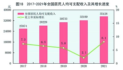 全年全國居民人均可支配收入35128元,比上年增長9.1%,扣除價(jià)格因素,實(shí)際增長8.1%。全國居民人均可支配收入中位數(shù)[53]29975元,增長8.8%。按常住地分,城鎮(zhèn)居民人均可支配收入47412元,比上年增長8.2%,扣除價(jià)格因素,實(shí)際增長7.1%。城鎮(zhèn)居民人均可支配收入中位數(shù)43504元,增長7.7%。農(nóng)村居民人均可支配收入18931元,比上年增長10.5%,扣除價(jià)格因素,實(shí)際增長9.7%。農(nóng)村居民人均可支配收入中位數(shù)16902元,增長11.2%。城鄉(xiāng)居民人均可支配收入比值為2.50,比上年縮小0.06。按全國居民五等份收入分組[54],低收入組人均可支配收入8333元,中間偏下收入組人均可支配收入18445元,中間收入組人均可支配收入29053元,中間偏上收入組人均可支配收入44949元,高收入組人均可支配收入85836元。全國農(nóng)民工人均月收入4432元,比上年增長8.8%。全年脫貧縣[55]農(nóng)村居民人均可支配收入14051元,比上年增長11.6%,扣除價(jià)格因素,實(shí)際增長10.8%。