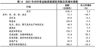 全年對(duì)外非金融類直接投資額7332億元,比上年下降3.5%,折1136億美元,增長3.2%。其中,對(duì)“一帶一路”沿線國家非金融類直接投資額203億美元,增長14.1%。(見表14)