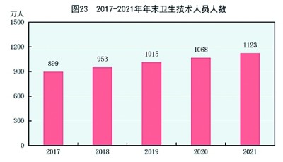 年末全國共有醫(yī)療衛(wèi)生機(jī)構(gòu)103.1萬個(gè),其中醫(yī)院3.7萬個(gè),在醫(yī)院中有公立醫(yī)院1.2萬個(gè),民營醫(yī)院2.5萬個(gè);基層醫(yī)療衛(wèi)生機(jī)構(gòu)97.7萬個(gè),其中鄉(xiāng)鎮(zhèn)衛(wèi)生院3.5萬個(gè),社區(qū)衛(wèi)生服務(wù)中心(站)3.6萬個(gè),門診部(所)30.7萬個(gè),村衛(wèi)生室59.9萬個(gè);專業(yè)公共衛(wèi)生機(jī)構(gòu)1.3萬個(gè),其中疾病預(yù)防控制中心3380個(gè),衛(wèi)生監(jiān)督所(中心)2790個(gè)。年末衛(wèi)生技術(shù)人員1123萬人,其中執(zhí)業(yè)醫(yī)師和執(zhí)業(yè)助理醫(yī)師427萬人,注冊(cè)護(hù)士502萬人。醫(yī)療衛(wèi)生機(jī)構(gòu)床位957萬張,其中醫(yī)院748萬張,鄉(xiāng)鎮(zhèn)衛(wèi)生院144萬張。全年總診療人次[70]85.3億人次,出院人數(shù)[71]2.4億人。截至年末,全國累計(jì)報(bào)告新型冠狀病毒肺炎確診病例102314例,累計(jì)治愈出院病例94792例,累計(jì)死亡4636人。全國累計(jì)報(bào)告接種新型冠狀病毒疫苗283533萬劑次。全國共有11937家醫(yī)療衛(wèi)生機(jī)構(gòu)提供新型冠狀病毒核酸檢測服務(wù),總檢測能力達(dá)到4168萬份/天。(見圖23)