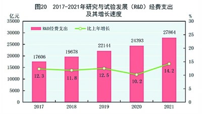 全年研究與試驗(yàn)發(fā)展(R&D)經(jīng)費(fèi)支出27864億元,比上年增長14.2%,與國內(nèi)生產(chǎn)總值之比為2.44%,其中基礎(chǔ)研究經(jīng)費(fèi)1696億元。國家自然科學(xué)基金共資助4.87萬個(gè)項(xiàng)目。截至年末,正在運(yùn)行的國家重點(diǎn)實(shí)驗(yàn)室533個(gè),納入新序列管理的國家工程研究中心191個(gè),國家企業(yè)技術(shù)中心1636家,大眾創(chuàng)業(yè)萬眾創(chuàng)新示范基地212家。國家科技成果轉(zhuǎn)化引導(dǎo)基金累計(jì)設(shè)立36支子基金,資金總規(guī)模624億元。國家級(jí)科技企業(yè)孵化器[60]1287家,國家備案眾創(chuàng)空間[61]2551家。全年授予專利權(quán)460.1萬件,比上年增長26.4%;PCT專利申請(qǐng)受理量[62]7.3萬件。截至年末,有效專利1542.1萬件,其中境內(nèi)有效發(fā)明專利270.4萬件。每萬人口高價(jià)值發(fā)明專利擁有量[63]7.5件。全年商標(biāo)注冊(cè)773.9萬件,比上年增長34.3%。全年共簽訂技術(shù)合同67萬項(xiàng),技術(shù)合同成交金額37294億元,比上年增長32.0%。(見圖20)(見表16)