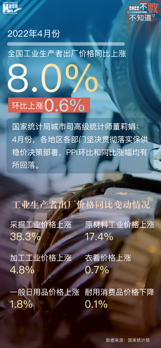 從全國工業(yè)生產(chǎn)者出廠價(jià)格指數(shù)(PPI)看,盡管國際大宗商品價(jià)格高位運(yùn)行,但各地區(qū)各部門貫徹落實(shí)保供穩(wěn)價(jià)決策部署,4月份PPI同比上漲8%,漲幅比上月回落0.3個(gè)百分點(diǎn)。
