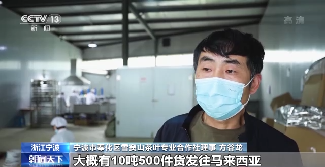 寧波市奉化區(qū)雪竇山茶葉專業(yè)合作社理事 方谷龍:我們這個集裝箱大概有10噸500件貨發(fā)往馬來西亞,這個是我們今年第6批出口。