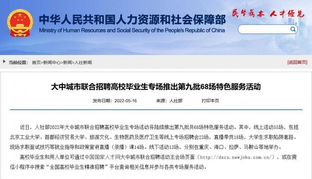 近日,人社部2022年大中城市聯(lián)合招聘高校畢業(yè)生專(zhuān)場(chǎng)活動(dòng)陸續(xù)推出第九批共68場(chǎng)特色服務(wù)活動(dòng)。其中,線(xiàn)上活動(dòng)55場(chǎng),包括北京工業(yè)大學(xué)、首都經(jīng)濟(jì)貿(mào)易大學(xué)、旅游文化、生物醫(yī)藥及醫(yī)療衛(wèi)生等線(xiàn)上專(zhuān)場(chǎng)招聘會(huì)23場(chǎng),直播帶崗18場(chǎng),大學(xué)生求職陷阱套路、現(xiàn)場(chǎng)求職面試技巧等就業(yè)指導(dǎo)和政策宣講直播(錄播)課14場(chǎng)。線(xiàn)下活動(dòng)13場(chǎng),分別在重慶、海口、拉薩、馬鞍山等地舉辦。