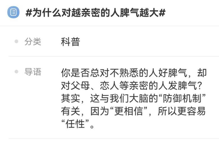 中新網(wǎng)客戶端北京6月22日電(記者 上官云)對陌生人和顏悅色,卻容易對親近的人心生不滿;明明是關(guān)心,話說出口卻成了指責(zé)……“為什么對越親密的人脾氣越大?”不久前,這個(gè)話題一度登上熱搜,很多人感嘆,自己也存在類似的問題。