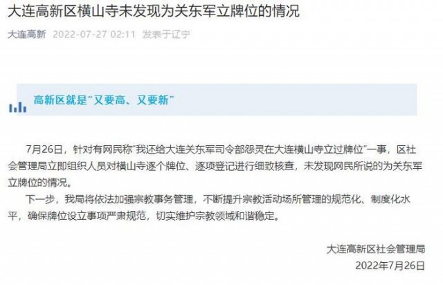 據(jù)大連高新微信公眾號(hào)消息, 7月26日,針對(duì)有網(wǎng)民稱“我還給大連關(guān)東軍司令部怨靈在大連橫山寺立過牌位”一事,區(qū)社會(huì)管理局立即組織人員對(duì)橫山寺逐個(gè)牌位、逐項(xiàng)登記進(jìn)行細(xì)致核查,未發(fā)現(xiàn)網(wǎng)民所說的為關(guān)東軍立牌位的情況。