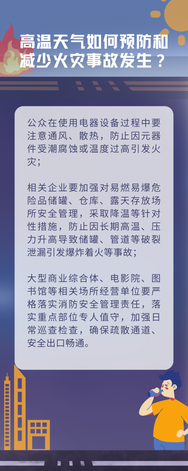 高溫天氣如何有效預(yù)防和減少火災(zāi)事故發(fā)生?應(yīng)急管理部消防救援局發(fā)布消防安全提示,公眾在使用電器設(shè)備過程中要注意通風(fēng)、散熱,防止因元器件受潮腐蝕或溫度過高引發(fā)火災(zāi);相關(guān)企業(yè)要加強(qiáng)對易燃易爆危險品儲罐、倉庫、露天存放場所安全管理,采取降溫等針對性措施,防止因長期高溫、壓力升高導(dǎo)致儲罐、管道等破裂泄漏引發(fā)爆炸著火等事故;大型商業(yè)綜合體、電影院、圖書館等相關(guān)場所經(jīng)營單位要嚴(yán)格落實(shí)消防安全管理責(zé)任,落實(shí)重點(diǎn)部位專人值守,加強(qiáng)日常巡查檢查,確保疏散通道、安全出口暢通。