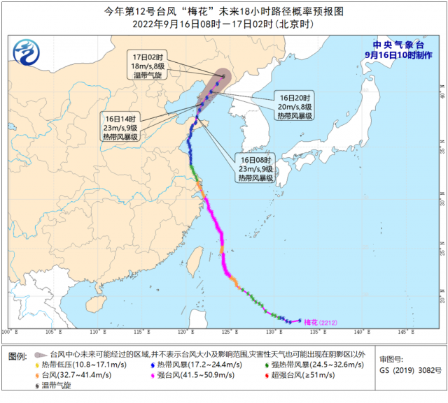 臺風(fēng)“梅花”未來24小時路徑概率預(yù)報圖(2022年9月16日8時至17日2時) 來源:中央氣象臺