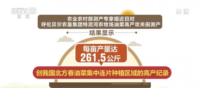 央視網(wǎng)消息:記者從內(nèi)蒙古自治區(qū)農(nóng)牧廳獲悉,農(nóng)業(yè)農(nóng)村部測(cè)產(chǎn)專家組近日對(duì)呼倫貝爾農(nóng)墾集團(tuán)特泥河農(nóng)牧場(chǎng)油菜高產(chǎn)攻關(guān)田測(cè)產(chǎn)的結(jié)果顯示,每畝產(chǎn)量達(dá)261.5公斤,創(chuàng)我國(guó)北方春油菜集中連片種植區(qū)域的高產(chǎn)紀(jì)錄。