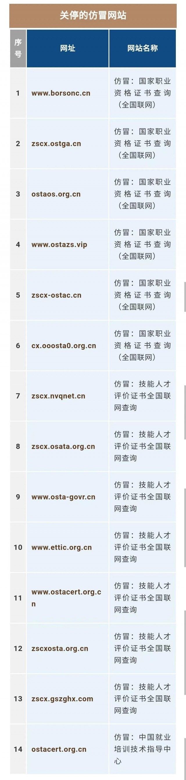 根據(jù)網(wǎng)絡(luò)巡查和群眾舉報(bào)情況,人力資源社會(huì)保障部聯(lián)合有關(guān)部門(mén)查實(shí)并關(guān)停了14個(gè)仿冒網(wǎng)站,其網(wǎng)站名稱(chēng)、網(wǎng)址及頁(yè)面內(nèi)容與人力資源社會(huì)保障部技能類(lèi)“職業(yè)資格證書(shū)”“職業(yè)技能等級(jí)證書(shū)”(以下簡(jiǎn)稱(chēng)技能類(lèi)評(píng)價(jià)證書(shū))查詢(xún)官方網(wǎng)站高度相似,容易誤導(dǎo)社會(huì)公眾。目前,上述14個(gè)網(wǎng)站均已被關(guān)停。
