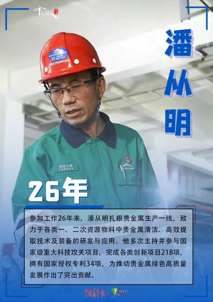 參加工作26年來,潘從明扎根貴金屬生產(chǎn)一線,致力于各類一、二次資源物料中貴金屬清潔、高效提取技術及裝備的研發(fā)與應用。他多次主持并參與國家級重大科技攻關項目,完成各類創(chuàng)新項目218項,擁有國家授權專利34項,為推動貴金屬綠色高質量發(fā)展作出了突出貢獻。