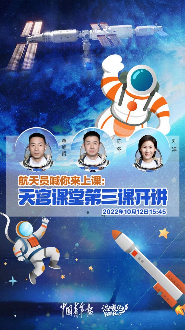 中國(guó)青年報(bào)客戶端北京10月12日電(中青報(bào)·中青網(wǎng)記者 邱晨輝)據(jù)中國(guó)載人航天工程辦公室消息,北京時(shí)間2022年10月12日16時(shí)01分,“天宮課堂”第三課在中國(guó)空間站開講,新晉“太空教師”陳冬、劉洋、蔡旭哲為廣大青少年帶來(lái)一場(chǎng)精彩的太空科普課,這是中國(guó)航天員首次在問(wèn)天實(shí)驗(yàn)艙內(nèi)進(jìn)行授課。