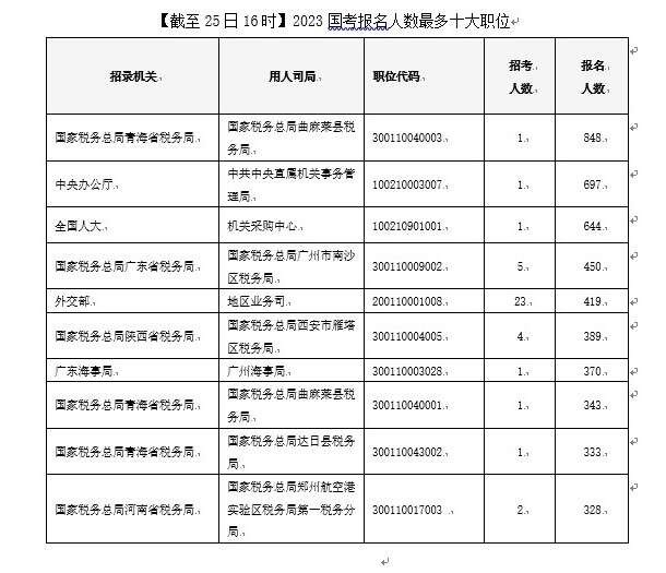 截至10月25日16時(shí),2023國考報(bào)名首日的“人氣之星”是國家稅務(wù)總局青海省稅務(wù)局曲麻萊縣稅務(wù)局這一職位,僅招錄1人,已有848人提交報(bào)名申請,報(bào)名首日競爭比已高達(dá)848:1。