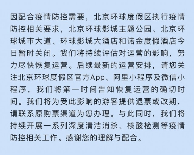 據(jù)@北京環(huán)球度假區(qū) 微博消息,因配合疫情防控需要,北京環(huán)球度假區(qū)執(zhí)行疫情防控相關(guān)要求,北京環(huán)球影城主題公園、北京環(huán)球城市大道、環(huán)球影城大酒店和諾金度假酒店今日暫時(shí)關(guān)閉。我們將持續(xù)評估對運(yùn)營的影響,努力盡快恢復(fù)運(yùn)營。后續(xù)最新的運(yùn)營安排,請您關(guān)注北京環(huán)球度假區(qū)官方App、阿里小程序及微信小程序,我們將第一時(shí)間告知恢復(fù)運(yùn)營的確切時(shí)間。我們將為受此影響的游客提供退票或改期,請聯(lián)系原購票渠道為您辦理。與此同時(shí),我們將持續(xù)開展一系列深度清潔消殺、核酸檢測等疫情防控相關(guān)工作。感謝您的理解與配合。