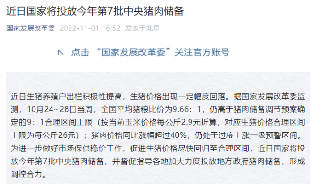 國(guó)家發(fā)展改革委:近日國(guó)家將投放今年第7批中央豬肉儲(chǔ)備
