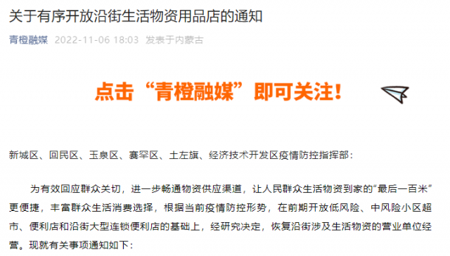 “青橙融媒”微信公眾號消息,呼和浩特市應對新型冠狀病毒感染肺炎疫情防控工作指揮部市場管控組發(fā)布《關(guān)于有序開放沿街生活物資用品店的通知》,具體內(nèi)容如下。