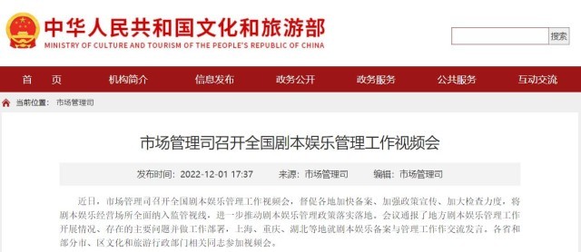 文旅部:將劇本娛樂經(jīng)營場所全面納入監(jiān)管視線