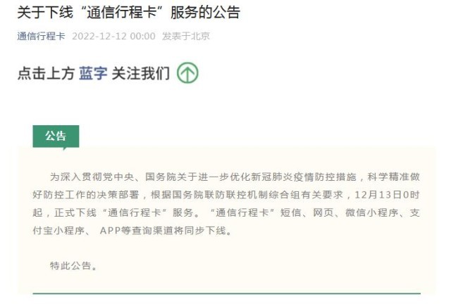 中國(guó)信息通信研究院12日通過(guò)微信公眾號(hào)發(fā)布公告稱(chēng),為深入貫徹黨中央、國(guó)務(wù)院關(guān)于進(jìn)一步優(yōu)化新冠肺炎疫情防控措施,科學(xué)精準(zhǔn)做好防控工作的決策部署,根據(jù)國(guó)務(wù)院聯(lián)防聯(lián)控機(jī)制綜合組有關(guān)要求,12月13日0時(shí)起,正式下線(xiàn)“通信行程卡”服務(wù)。“通信行程卡”短信、網(wǎng)頁(yè)、微信小程序、支付寶小程序、 APP等查詢(xún)渠道將同步下線(xiàn)。
