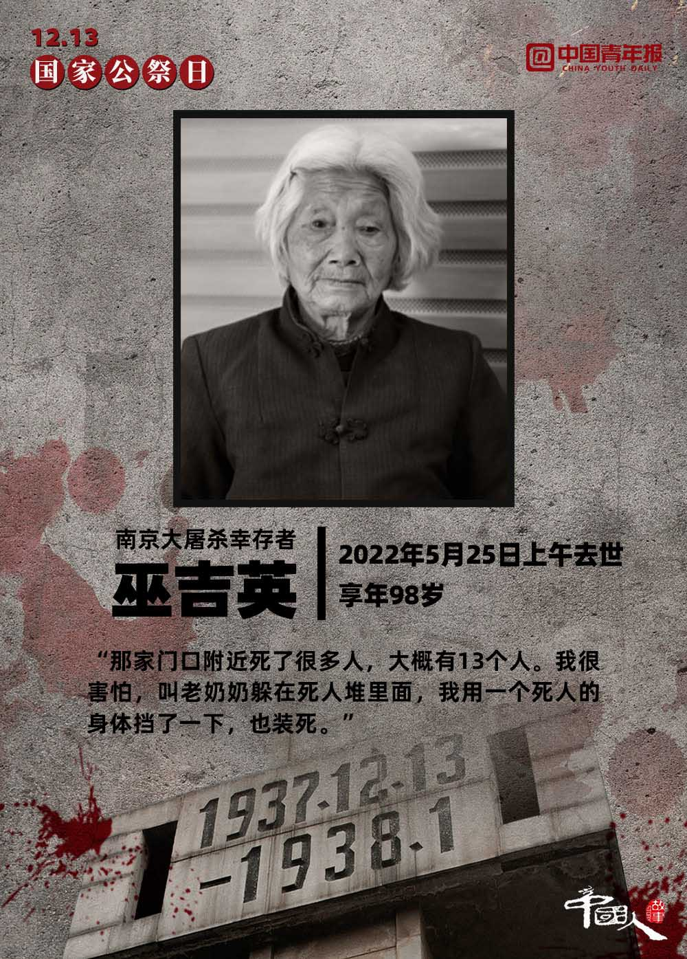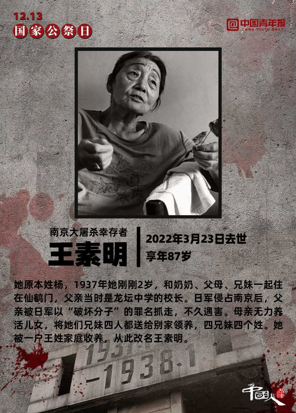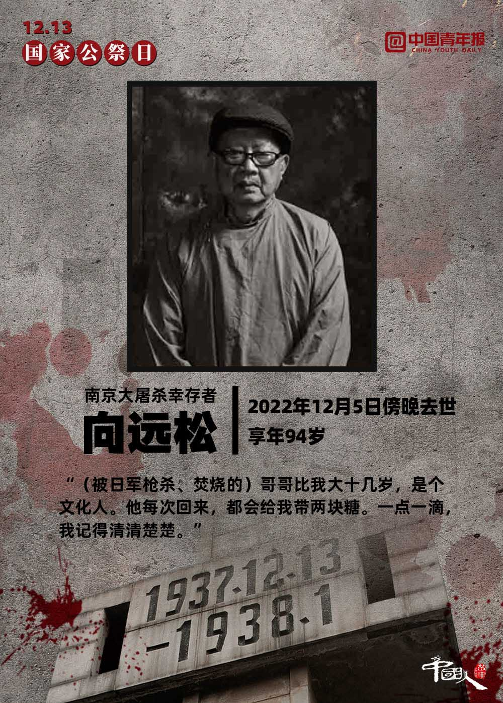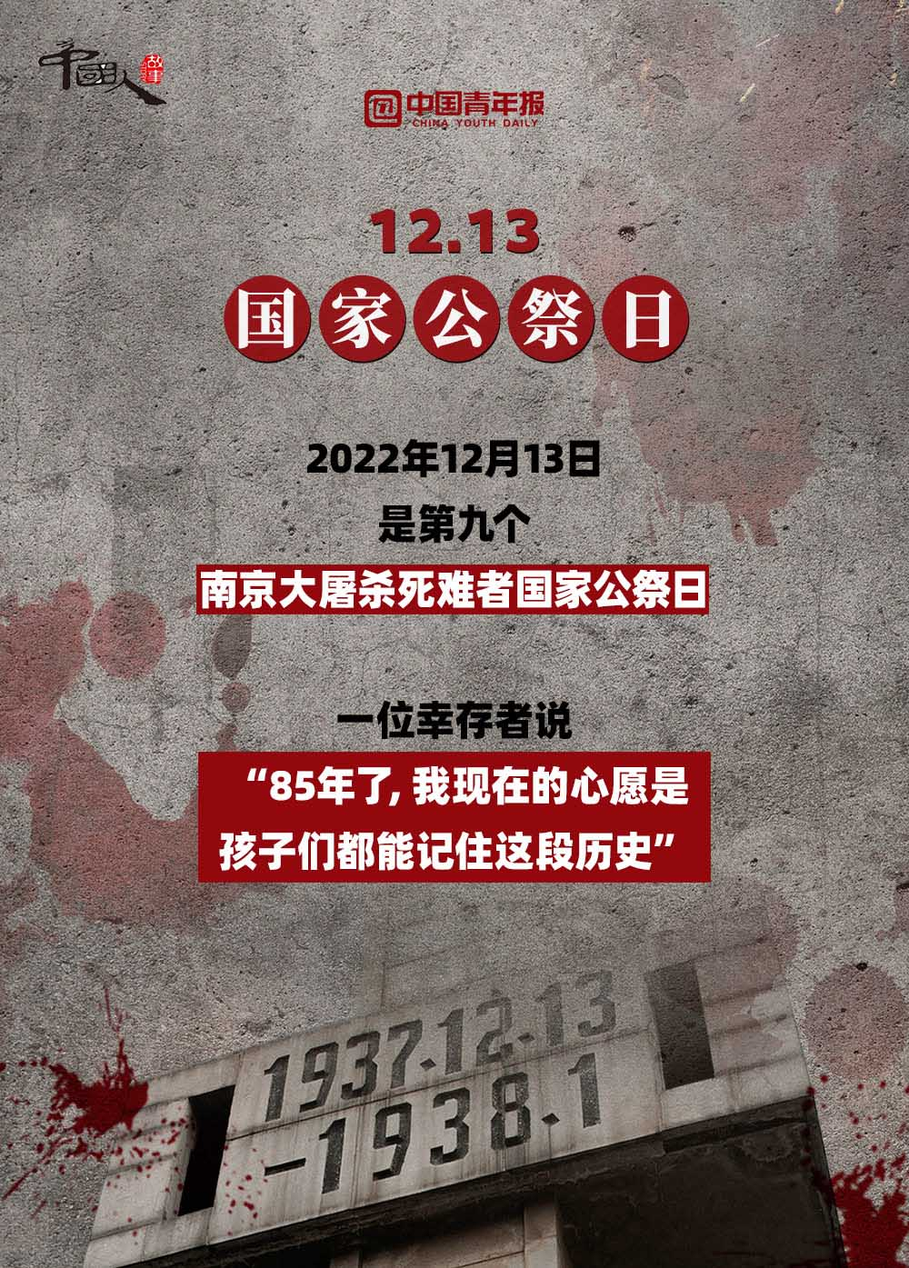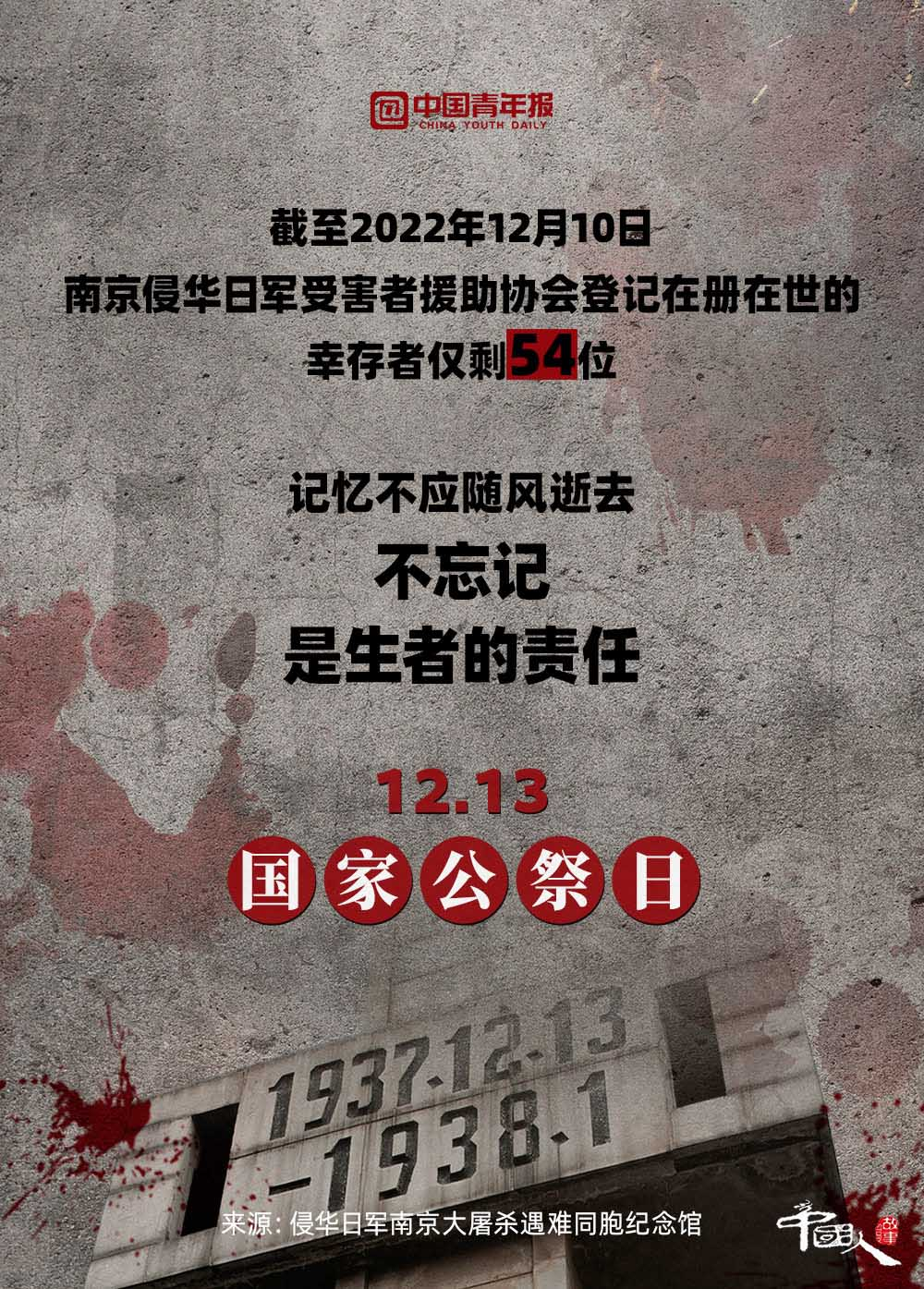 12月13日,是第九個南京大屠殺死難者國家公祭日 。截至2022年12月12日,南京侵華日軍受害者援助協(xié)會登記在冊在世的幸存者僅剩54位。一位南京大屠殺幸存者說:“85年了,我現(xiàn)在的心愿是孩子們都能記住這段歷史。”讓我們將這段歷史銘刻在內(nèi)心深處,讓“記住”化作一種責任,伴著我們堅定前行。
