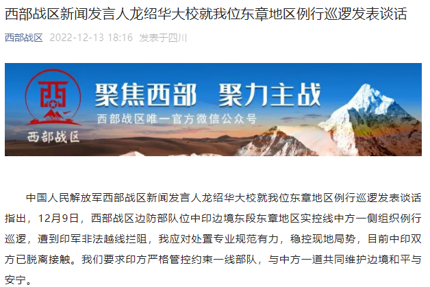 中國(guó)人民解放軍西部戰(zhàn)區(qū)新聞發(fā)言人龍紹華大校就我位東章地區(qū)例行巡邏發(fā)表談話指出,12月9日,西部戰(zhàn)區(qū)邊防部隊(duì)位中印邊境東段東章地區(qū)實(shí)控線中方一側(cè)組織例行巡邏,遭到印軍非法越線攔阻,我應(yīng)對(duì)處置專業(yè)規(guī)范有力,穩(wěn)控現(xiàn)地局勢(shì),目前中印雙方已脫離接觸。我們要求印方嚴(yán)格管控約束一線部隊(duì),與中方一道共同維護(hù)邊境和平與安寧。