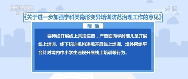 《意見》明確,要持續(xù)開展線上常規(guī)巡查,嚴查面向?qū)W齡前兒童開展線上培訓、線下培訓機構(gòu)違規(guī)開展線上培訓、境外網(wǎng)絡(luò)平臺針對境內(nèi)中小學生違規(guī)開展線上培訓等行為。