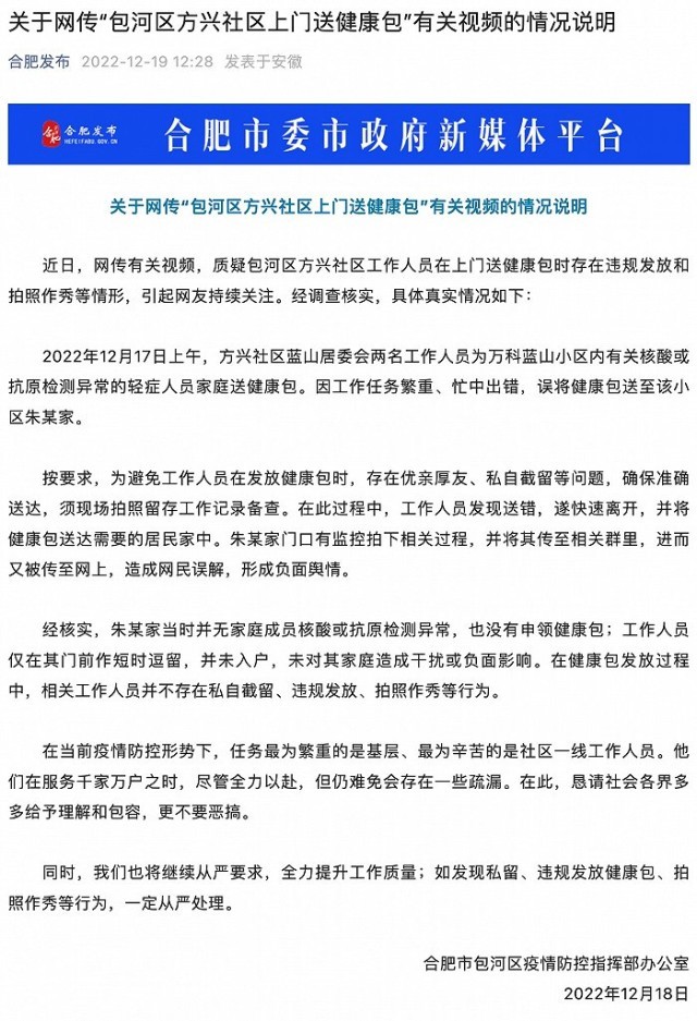 央視網(wǎng)消息:“合肥發(fā)布”微信公眾號12月19日消息,合肥市包河區(qū)疫情防控指揮部辦公室發(fā)布情況說明稱,近日,網(wǎng)傳有關(guān)視頻,質(zhì)疑包河區(qū)方興社區(qū)工作人員在上門送健康包時存在違規(guī)發(fā)放和拍照作秀等情形,引起網(wǎng)友持續(xù)關(guān)注。經(jīng)調(diào)查核實,具體真實情況如下: