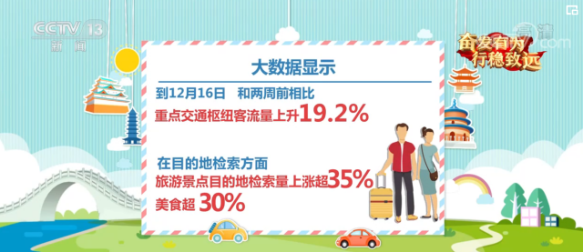 防控措施的優(yōu)化讓不少城市的人間“煙火氣”悄然回歸。大數(shù)據(jù)顯示,到12月16日,和兩周前相比,重點交通樞紐客流量上升19.2%。在目的地檢索方面,旅游景點目的地檢索量上漲超35%、美食超30%。