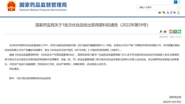 國家藥監(jiān)局官網(wǎng)消息,在2022年國家化妝品監(jiān)督抽檢工作中,經(jīng)四川省藥品檢驗研究院(四川省醫(yī)療器械檢測中心)檢驗,標(biāo)簽標(biāo)示為生產(chǎn)商廣州冪姿生物科技有限公司、總經(jīng)銷重慶郡燦化妝品有限公司生產(chǎn)的鑫彤祛痘精華,檢出《化妝品安全技術(shù)規(guī)范(2015年版)》中規(guī)定的禁用原料。