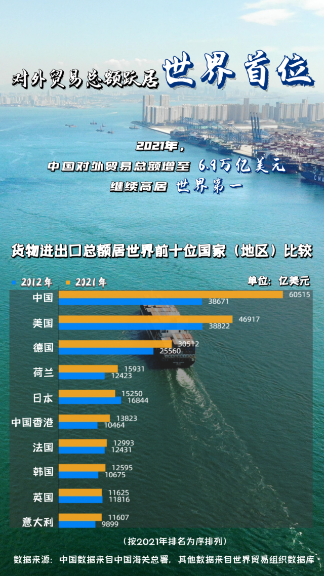 2020年中國對外貿易總額由2012年的4.4萬億美元升至5.3萬億美元,首超美國成為全球第一大貿易國。2021年,中國對外貿易總額加快上升增至6.9萬億美元,繼續(xù)高居世界第一。在經濟全球化頻遭單邊主義、保護主義等“逆流”襲擾的歷史當口,中國從融入和適應全球化走向推動和引領全球化,積極倡導建設開放型世界經濟,推動經濟全球化朝著更加開放、包容、普惠、平衡、共贏方向發(fā)展。目前,中國已成為140多個國家和地區(qū)的主要貿易伙伴,形成更大范圍、更寬領域、更深層次對外開放格局。