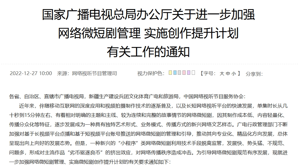 然而一種新興的“小程序”類網(wǎng)絡(luò)微短劇利用技術(shù)手段脫離監(jiān)管,發(fā)展快、勢頭猛、不規(guī)范、問題多,形成對主流作品“劣幣驅(qū)逐良幣”的擠出效應(yīng),對網(wǎng)絡(luò)傳播秩序造成沖擊。為引導(dǎo)網(wǎng)絡(luò)微短劇規(guī)范有序發(fā)展,廣電總局此次就進(jìn)一步加強(qiáng)網(wǎng)絡(luò)微短劇管理、實施微短劇創(chuàng)作提升計劃發(fā)布一系列具體措施。
