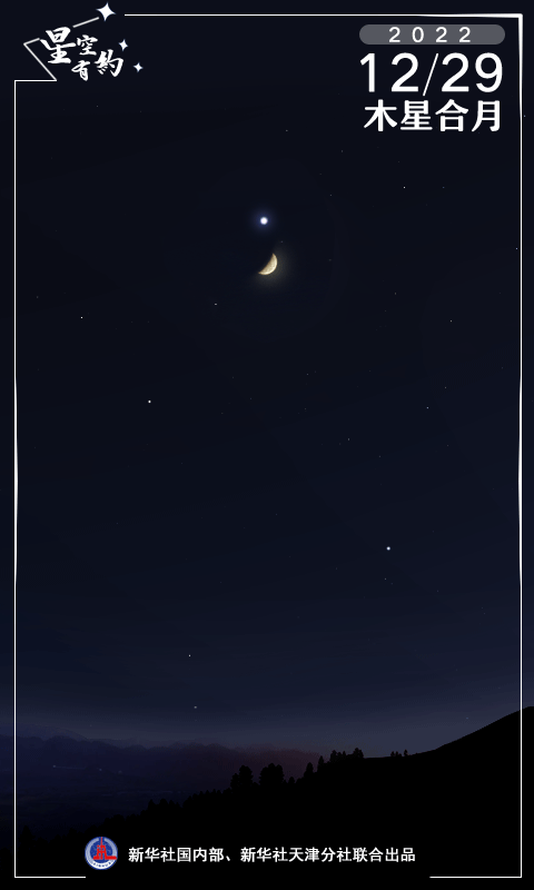 新華社天津12月27日電(記者周潤健)天文科普專家介紹,12月29日晚天宇將上演木星合月,這是2022年最后一場行星合月。屆時(shí)只要天氣晴好,我國公眾可在南方天空欣賞到明亮木星與一輪上弦月近距離競輝的唯美畫面。