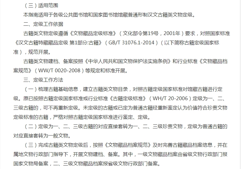 據(jù)悉,《指南》明確了公共圖書館領域古籍類文物定級的總體要求、工作依據(jù)、工作方法等相關規(guī)范及要求。適用于各級公共圖書館和國家圖書館館藏普通形制漢文古籍類文物定級。