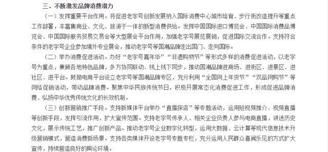 《通知》表示,不斷激發(fā)品牌消費潛力。發(fā)揮中國國際進(jìn)口博覽會、中國國際消費品博覽會、中國國際服務(wù)貿(mào)易交易會等大型展會平臺作用,加強老字號展覽展銷,促進(jìn)國際交流合作。支持符合條件的老字號企業(yè)參加境外專業(yè)展會,推動老字號等國潮品牌走出國門、走向國際。