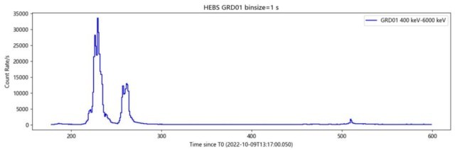 由中科院高能物理研究所研制的高能爆發(fā)探索者(HEBS)于北京時間2022年10月9日21時17分,與我國慧眼衛(wèi)星和高海拔宇宙線觀測站同時探測到迄今最亮的伽馬射線暴(編號為GRB 221009A)。根據(jù)HEBS的精確測量結(jié)果,該伽馬暴比以往人類觀測到的最亮伽馬射線暴還亮10倍以上。由于該伽馬射線暴的亮度極高,國際上絕大部分探測設(shè)備均發(fā)生了嚴(yán)重的數(shù)據(jù)飽和丟失、脈沖堆積等儀器效應(yīng),難以獲得精確測量結(jié)果。HEBS憑借創(chuàng)新的探測器設(shè)計以及新穎的高緯度觀測模式設(shè)置,探測器經(jīng)受住了高計數(shù)率的考驗,獲得了高時間分辨率的光變曲線,以及10千電子伏至5兆電子伏的寬能段能譜。HEBS極為寶貴的精確測量結(jié)果對于揭示伽馬射線暴的起源和輻射機(jī)制具有重要意義。