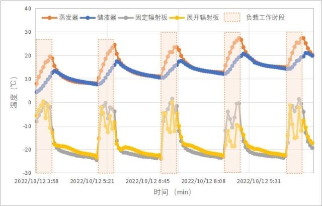 中科院微小衛(wèi)星創(chuàng)新院的可展收式輻射器成功在軌實現(xiàn)首次應(yīng)用,輻射器執(zhí)行機(jī)構(gòu)已順利完成六十余次展開和收攏動作,連續(xù)五軌動態(tài)試驗結(jié)果(如圖10)表明環(huán)路熱管-可展收式輻射器集成系統(tǒng)在負(fù)載工作時段啟動性能良好,輻射器連續(xù)展開-收攏可實現(xiàn)散熱能力在軌大范圍調(diào)控。