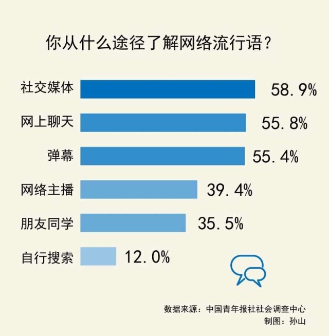 數(shù)據(jù)顯示,微博、小紅書、微信等社交媒體(58.9%)是受訪青年知曉網(wǎng)絡(luò)流行語的主要途徑。接下來是網(wǎng)上聊天(55.8%)、彈幕(55.4%)。其他還有:網(wǎng)絡(luò)主播(39.4%)、朋友同學(xué)(35.5%)和自行搜索(12.0%)等。