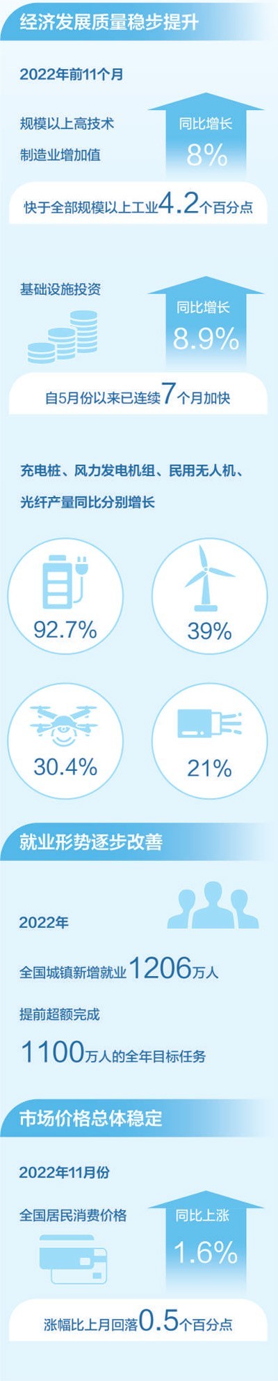 2022年,面對(duì)風(fēng)高浪急的國(guó)際環(huán)境和艱巨繁重的國(guó)內(nèi)改革發(fā)展穩(wěn)定任務(wù),我國(guó)經(jīng)濟(jì)穩(wěn)健發(fā)展,全年國(guó)內(nèi)生產(chǎn)總值預(yù)計(jì)超過120萬億元??垂┙o結(jié)構(gòu),產(chǎn)業(yè)升級(jí)發(fā)展持續(xù),新動(dòng)能積蓄增強(qiáng)。2022年前11個(gè)月,規(guī)模以上高技術(shù)制造業(yè)增加值同比增長(zhǎng)8%,快于全部規(guī)模以上工業(yè)4.2個(gè)百分點(diǎn);看消費(fèi)需求,線上消費(fèi)需求釋放帶動(dòng)作用明顯。前11個(gè)月,全國(guó)實(shí)物商品網(wǎng)上零售額同比增長(zhǎng)6.4%,網(wǎng)絡(luò)購(gòu)物帶動(dòng)快遞等行業(yè)較快增長(zhǎng)。