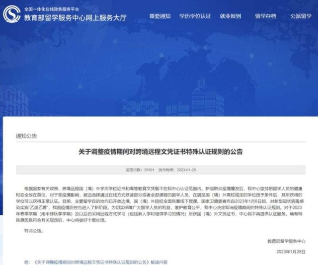 中國(guó)青年報(bào)客戶端北京1月29日電(中青報(bào)·中青網(wǎng)記者 葉雨婷)記者從教育部留學(xué)服務(wù)中心(以下簡(jiǎn)稱“中心”)官方網(wǎng)站獲悉,1月28日,中心發(fā)布《關(guān)于調(diào)整疫情期間對(duì)跨境遠(yuǎn)程文憑證書特殊認(rèn)證規(guī)則的公告》指出,對(duì)于2023年春季學(xué)期(南半球秋季學(xué)期)及以后仍采用遠(yuǎn)程方式學(xué)習(xí)(包括新入學(xué)和繼續(xù)學(xué)習(xí)的情況)所獲國(guó)(境)外文憑證書,中心將不再提供認(rèn)證服務(wù)。
