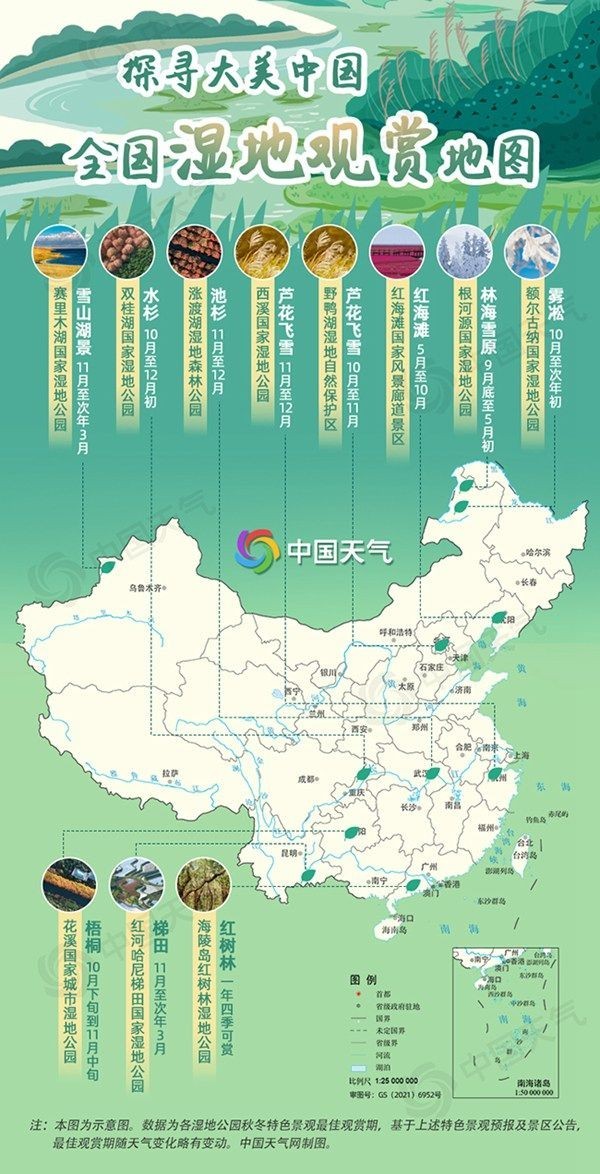 濕地不僅能為人們提供四季不同的可觀賞景觀,還是十分重要的自然生態(tài)系統(tǒng),為大量的動植物提供棲息地,既能保護生物的多樣性,也能調(diào)節(jié)氣候、凈化水質(zhì)。有興趣的朋友可根據(jù)最佳觀賞期前往觀賞,提醒大家出游仍需注意佩戴口罩,做好健康防護工作。(中國天氣網(wǎng) 文/江漪 設(shè)計/任成英 數(shù)據(jù)支持/李靚)