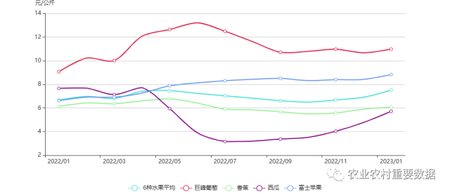 2023年1月,6種水果平均批發(fā)價(jià)格為7.51元/公斤,環(huán)比上漲8.68%,其中:巨峰葡萄、香蕉、西瓜和富士蘋果批發(fā)價(jià)格分別為10.99元/公斤、6.07元/公斤、5.72元/公斤、8.83元/公斤,比上月分別上漲2.90%、2.88%、19.92%、4.87%。