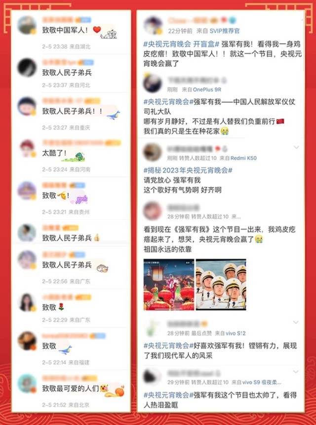 “請(qǐng)黨放心,強(qiáng)軍有我”“清澈的愛,獻(xiàn)給我的祖國”……聲聲誓言、字字鏗鏘。首次參加總臺(tái)元宵晚會(huì)的中國人民解放軍儀仗司禮大隊(duì)奏唱的歌曲《強(qiáng)軍有我》,不僅唱出中國軍人的拳拳赤子心,更唱出了“最可愛的人”那豪邁激情和磅礴氣勢(shì)。整齊劃一的動(dòng)作、堅(jiān)定有力的眼神讓無數(shù)網(wǎng)友直呼:“震撼!這就是中國排面”“為人民子弟兵熱淚盈眶”“致敬中國軍人!感謝你們?yōu)榇蠹邑?fù)重前行”。而網(wǎng)友們也用整齊一致的留言共同致敬“最可愛的人”。