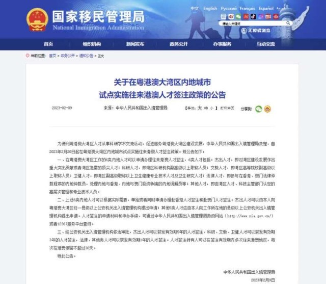 中國(guó)青年報(bào)客戶端北京2月9日電(中青報(bào)·中青網(wǎng)記者 何春中)中華人民共和國(guó)出入境管理局2月9日發(fā)布公告,為便利粵港澳大灣區(qū)人才從事科研學(xué)術(shù)交流活動(dòng),促進(jìn)服務(wù)粵港澳大灣區(qū)建設(shè)發(fā)展,自2023年2月20日起在粵港澳大灣區(qū)內(nèi)地城市試點(diǎn)實(shí)施往來(lái)港澳人才簽注政策。
