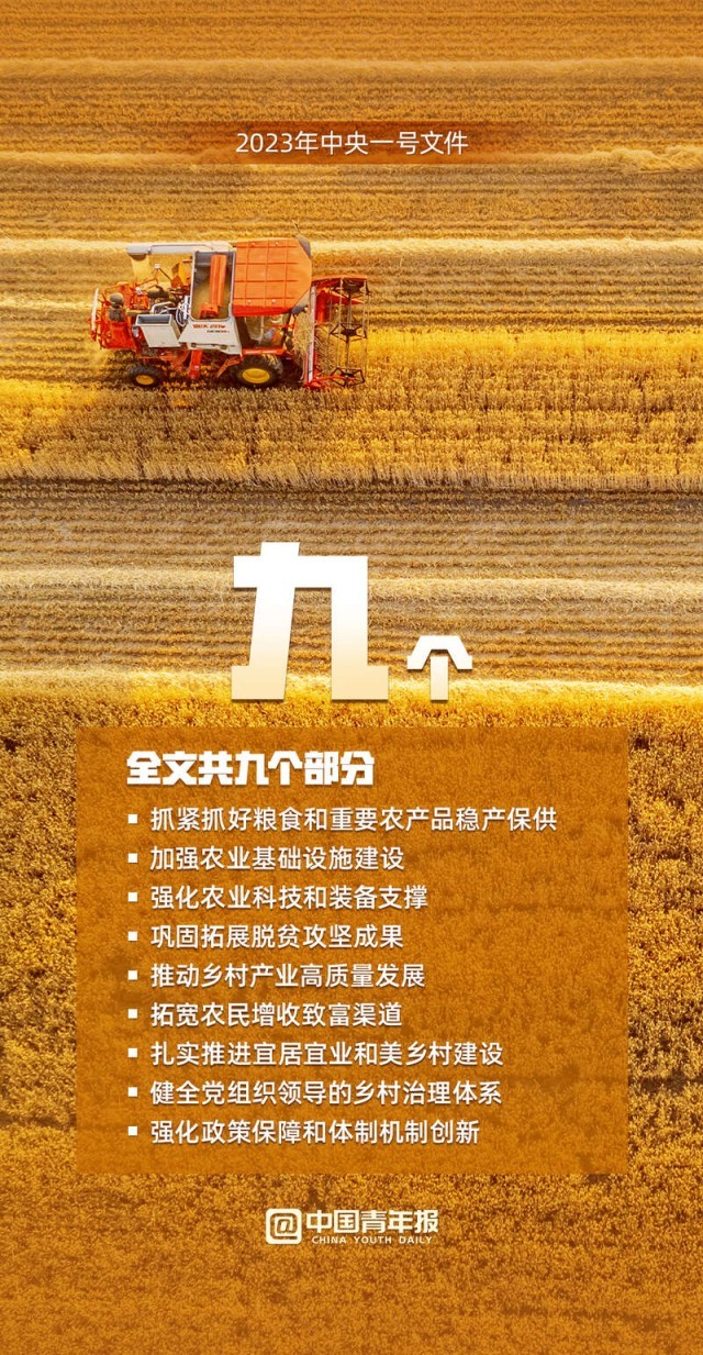 中國青年報客戶端訊(中青報·中青網(wǎng)見習(xí)記者 魏婉 制圖 程璨)“確保全國糧食產(chǎn)量保持在1.3萬億斤以上、確保脫貧勞動力就業(yè)規(guī)模穩(wěn)定在3000萬人以上……”2月13日,2023年中央一號文件正式發(fā)布,這份文件題為《中共中央 國務(wù)院關(guān)于做好2023年全面推進(jìn)鄉(xiāng)村振興重點(diǎn)工作的意見》,全文共九個部分。文件提出,堅決守牢確保糧食安全、防止規(guī)模性返貧等底線,扎實推進(jìn)鄉(xiāng)村發(fā)展、鄉(xiāng)村建設(shè)、鄉(xiāng)村治理等重點(diǎn)工作,加快建設(shè)農(nóng)業(yè)強(qiáng)國,建設(shè)宜居宜業(yè)和美鄉(xiāng)村。