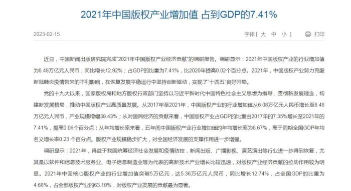 國家版權局:2021中國版權產業(yè)增加值占GDP7.41%