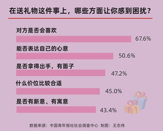 中國青年報(bào)社社會(huì)調(diào)查中心的調(diào)查顯示,在送禮物上,69.9%的受訪青年感到有困擾,且男生有困擾的比例高于女生,這也從一定程度上反映出男生在禮物選擇和情感表達(dá)上更為糾結(jié)。