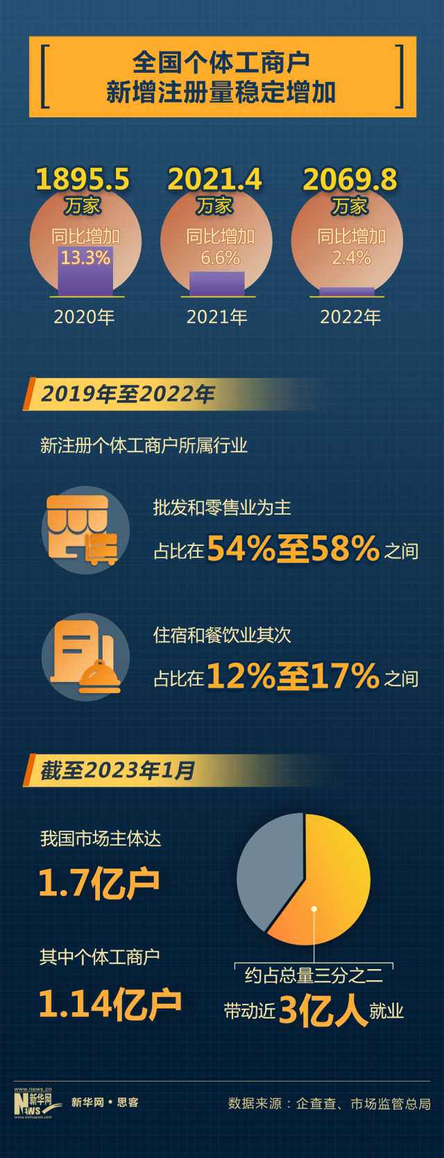 近日市場(chǎng)監(jiān)管總局統(tǒng)計(jì)顯示,截至2023年1月,我國(guó)市場(chǎng)主體達(dá)1.7億戶,其中個(gè)體工商戶1.14億戶,約占總量三分之二,帶動(dòng)近3億人就業(yè)。