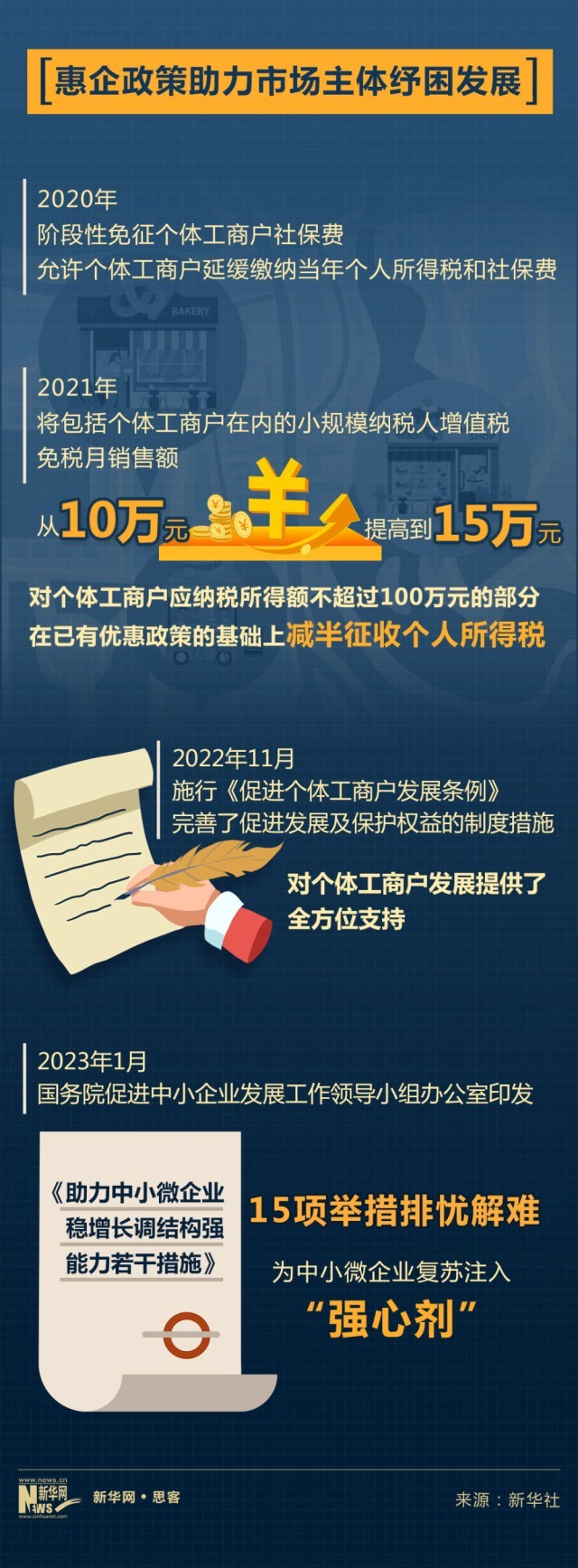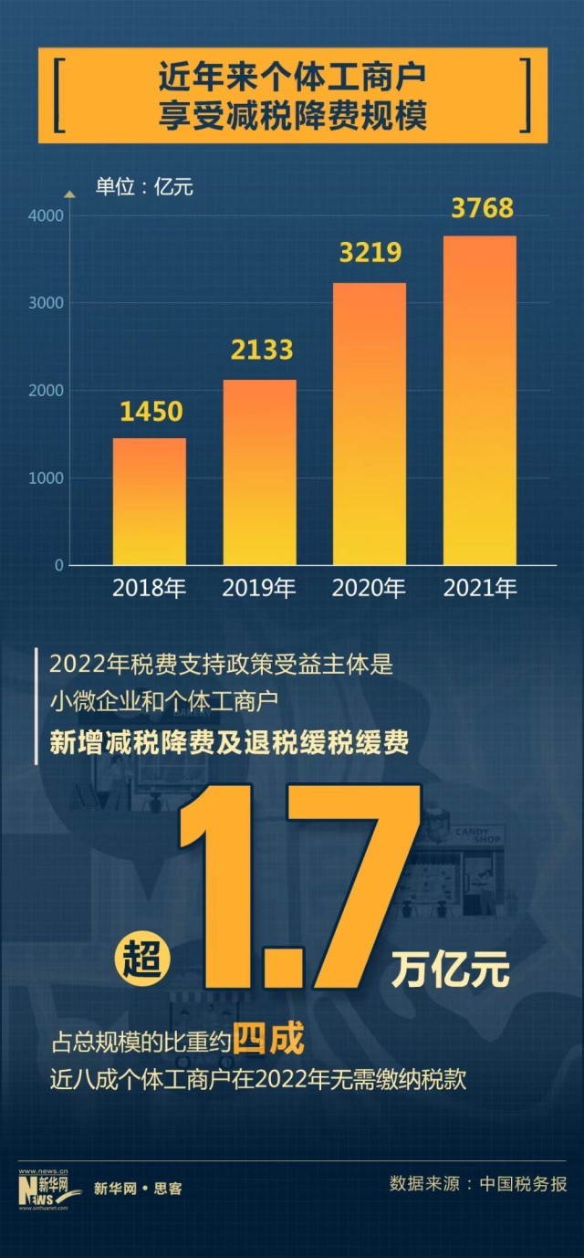 2021年,我國(guó)將包括個(gè)體工商戶在內(nèi)的小規(guī)模納稅人增值稅免稅月銷(xiāo)售額從10萬(wàn)元提高到15萬(wàn)元,對(duì)個(gè)體工商戶應(yīng)納稅所得額不超過(guò)100萬(wàn)元的部分,在已有優(yōu)惠政策的基礎(chǔ)上減半征收個(gè)人所得稅。
