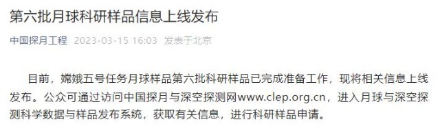 央視網(wǎng)消息:據(jù)“中國探月工程”微信公眾號消息,目前,嫦娥五號任務(wù)月球樣品第六批科研樣品已完成準備工作,現(xiàn)將相關(guān)信息上線發(fā)布。公眾可通過訪問中國探月與深空探測網(wǎng)www.clep.org.cn,進入月球與深空探測科學(xué)數(shù)據(jù)與樣品發(fā)布系統(tǒng),獲取有關(guān)信息,進行科研樣品申請。