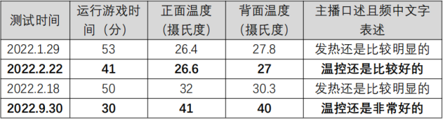 問題描述:博主于2022年1月至9月先后4次對不同手機進(jìn)行溫度測試。在經(jīng)過一定時間運行游戲后,使用測溫儀對手機正面及背面進(jìn)行測溫,并對手機的溫控效果進(jìn)行點評,4次測評結(jié)果出入較大,不同品牌的手機測評前后標(biāo)準(zhǔn)不一。